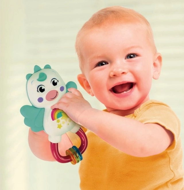 Interaktivna zvečka Jednorog osmišljena je za prirodan razvoj djeteta. Kombinacija meke gume na krilcima za sigurno grickanje i raznolikih tekstura pruža bogatu multisenzornu stimulaciju. Lagan dizajn pristaje malenim ručicama te potiče vid, sluh i dodir.