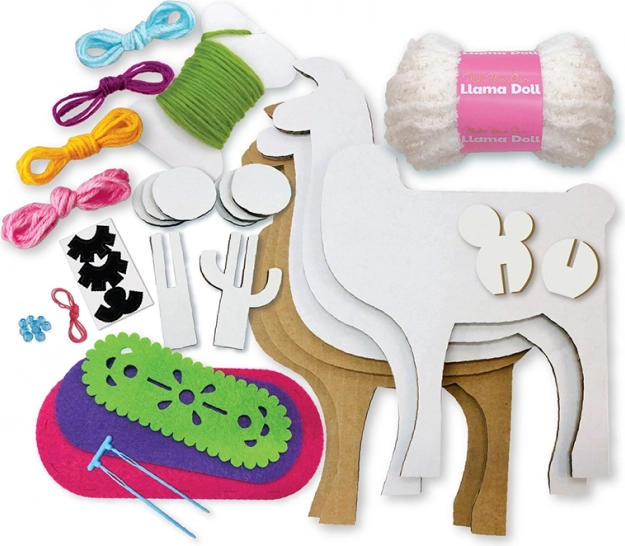 Sadrži sve materijale potrebne za izradu lame, uključujući kartonske izreze, šarene konce i komadiće tkanine.