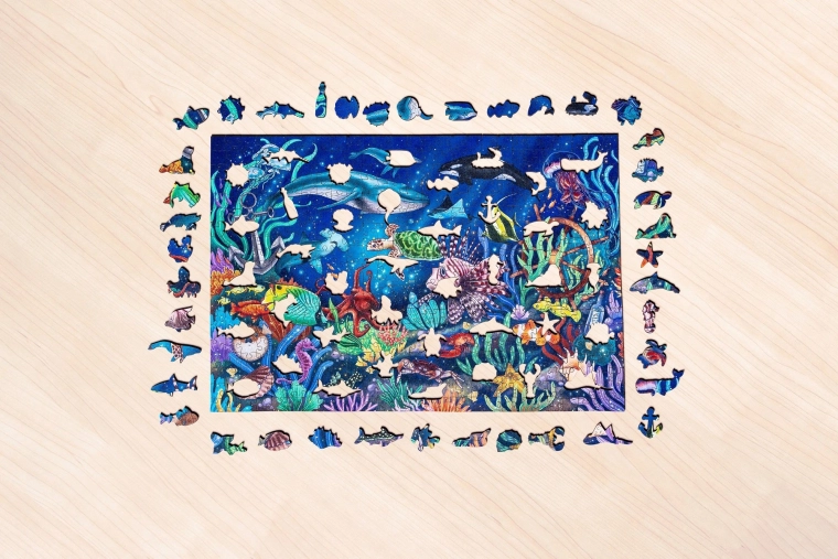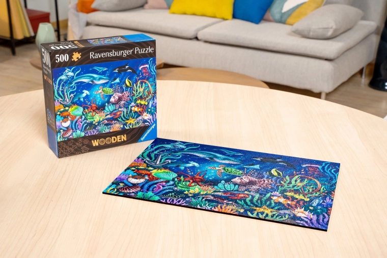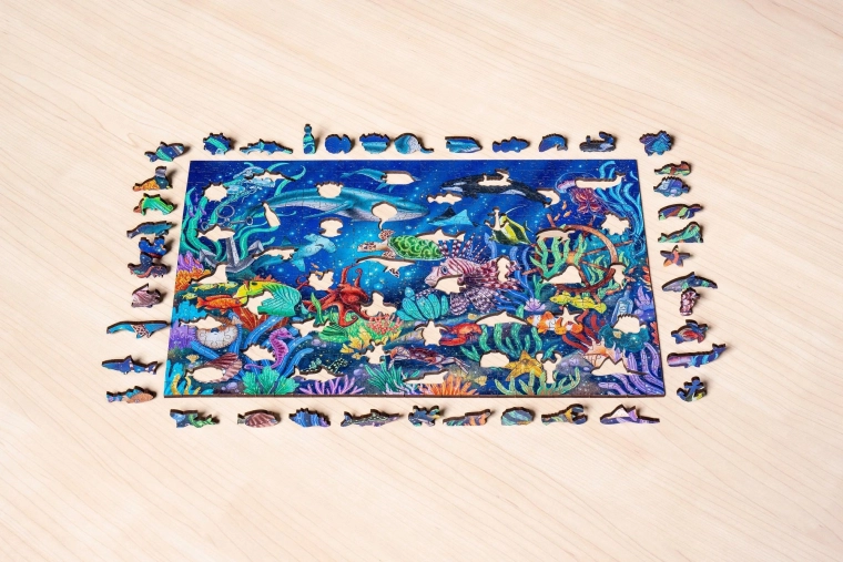 Uzmite trenutak za sebe i uronite u fascinantan motiv oceana punog riba, koralja i morskih stvorenja. Drvene puzzle s 500 dijelova spajaju kvalitetnu izradu, elegantan dizajn i promišljenu zabavu za cijelu obitelj. Zahvaljujući precizno izrezanim oblicima, uključujući dijelove koji podsjećaju na životinje i biljke, slaganje je maštovito i privlačno.