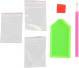 Sadrži sve potrebne dodatke, uključujući aplikacijsko pero, posudu za kamenčiće i vosak.