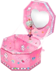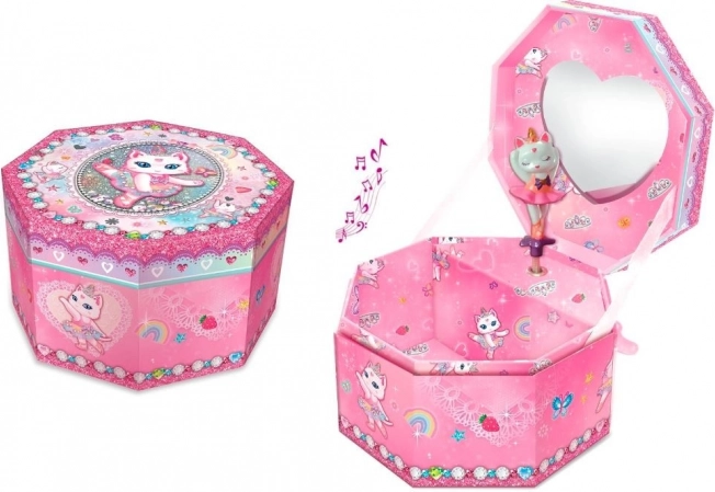 Čarobna osmerokutna glazbena kutijica za nakit s motivom mačke balerine razveselit će svako dijete. Nakon otvaranja figurica se zavrti i zazvuči klasična melodija. Kutijica ima ogledalce, prostor za sitnice i radi na mehaničko navijanje bez baterija.