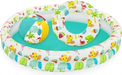 Set sadrži nafukavajući bazen, plivaći kolut i plažnu loptu – sve usklađeno u razigranom tropskom dizajnu. Djeca odmah imaju sve pri ruci za sigarne vodene igre.