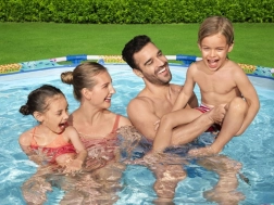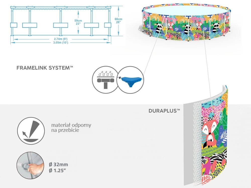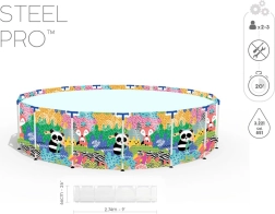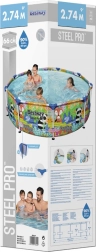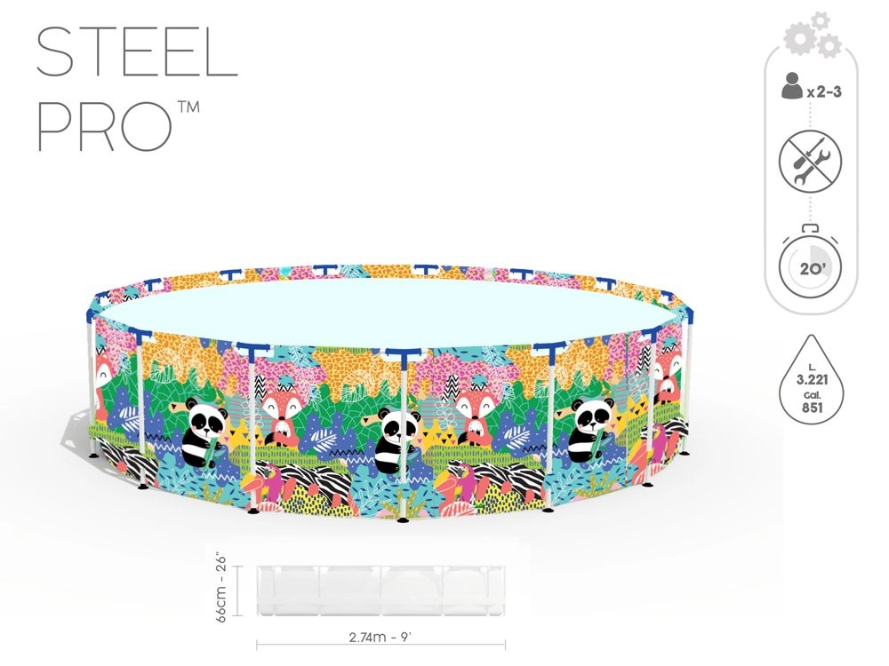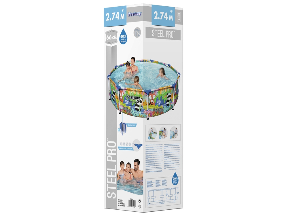 Uživajte u ljetu s prostranim dječjim okvirnim bazenom BESTWAY Steel Pro dimenzija 274 × 66 cm. Izdržljiva konstrukcija Steel Pro sa sustavom FrameLink i troslojni materijal DuraPlus osiguravaju visoku stabilnost i dug vijek trajanja. Šareni tisk s životinjama oduševit će djecu, a jednostavno ispuštanje vode omogućuje integrirani ispusni ventil. Kompatibilan sa sustavom FlowClear.