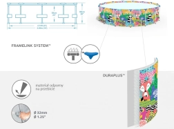 Čvrsta metalna konstrukcija s tehnologijom FrameLink pruža izvrsnu stabilnost i smanjuje koroziju na metalnim spojevima, kako bi bazen potrajao više sezona.