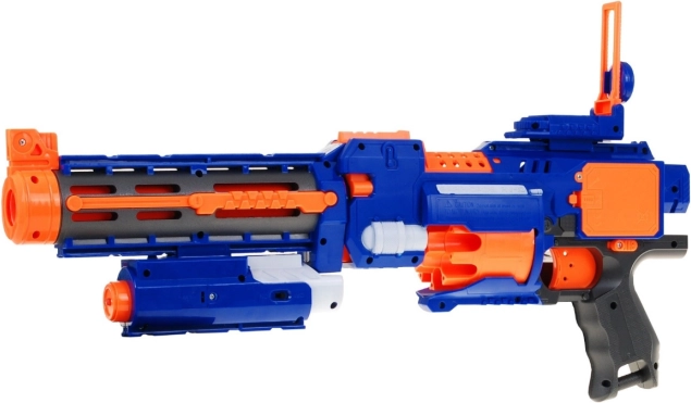 Pritisnite okidač i blaster neprekidno ispaljuje pojedinačne strelice brzinom do 3 u sekundi. Pogon osigurava električni kompresor napajan 3× AAA baterijama (nisu uključene).