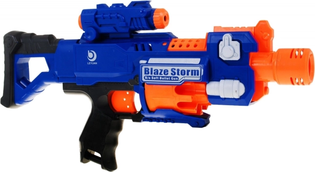 BLAZE STORM je dječji električni blaster osmišljen za sigurnu i dinamičnu igru. Zahvaljujući potpuno automatskom električnom kompresoru (napajanje 3× AA, nisu uključene) omogućuje brzu paljbu bez ručnog natezanja. Prednje punjenje i bubnjasti spremnik za 10 metaka osiguravaju neprekidnu akciju, dok klizni prozor olakšava uklanjanje eventualno zaglavljenih strelica.