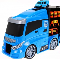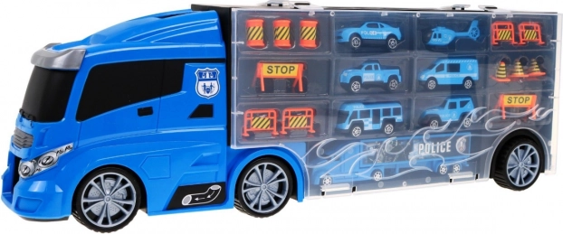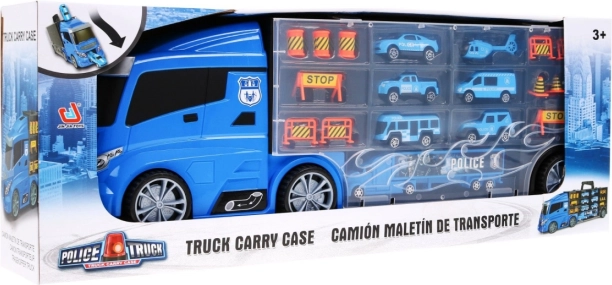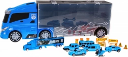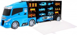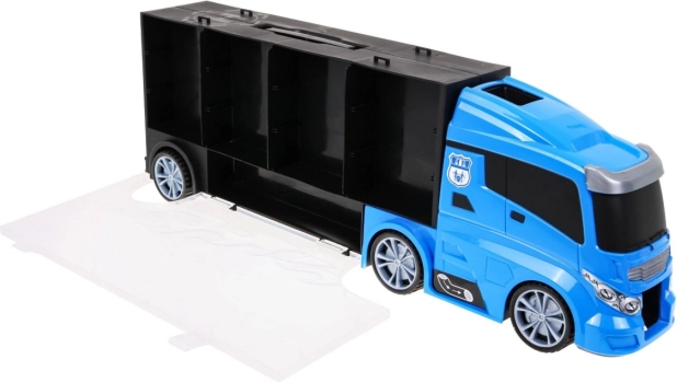Otkrijte multifunkcionalni policijski kamion koji služi kao praktičan organizator za autiće i sjajan igraći set. Sa strane se nalaze dva otvarajuća spremišna prostora – s jedne strane 13 manjih pretinaca, s druge 5 većih. Iznad kabine je ulaz na tobogan koji prolazi kroz kabinu i završava sprijeda. Gornja površina kamiona može poslužiti kao „zračna luka“ za helikopter. Zahvaljujući udobnoj ručki djeca mogu ponijeti set kamo god požele.
