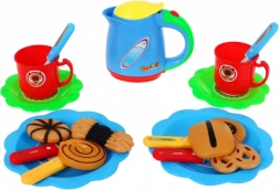 U kompletu su tanjurići, šalice, pribor za jelo, posudice za slatkiše, čajnik i zviždaljka – sve u živim bojama. Set dolazi u šarenoj poklon-kutiji i idealan je kao dar. Igračka je namijenjena djeci od 3 godine i ima CE certifikaciju. Napajanje: 3× AG3 (uključeno u pakiranje).