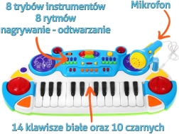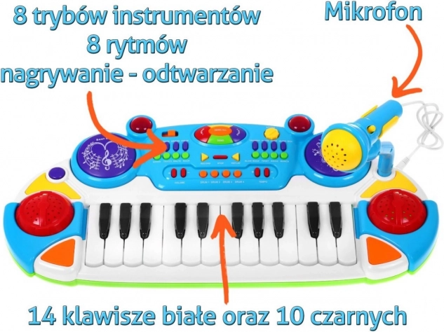 Plavi glazbeni set savršen je izbor za male ljubitelje glazbe. Sadrži klavijature s dvije oktave, mikrofon i svjetlucava svjetla, što omogućuje djeci eksperimentiranje sa zvukovima i svjetlima tijekom sviranja.
