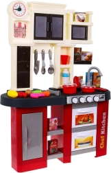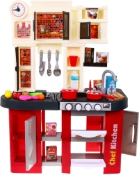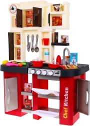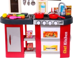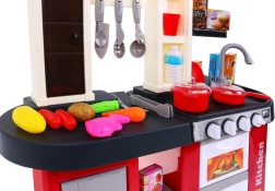 Ova prostrana plastična kuhinjica u crveno-crnom dizajnu donosi djeci od 3 godine autentičan doživljaj kuhanja. Realni svjetlosni efekti i zvukovi kuhanja i prženja nakon okretanja gumba potiču kreativnu igru i razvoj motorike. Sastavni dio je i radna vodovodna slavina, koja zabavu podiže na višu razinu.