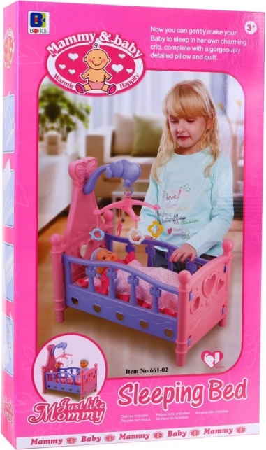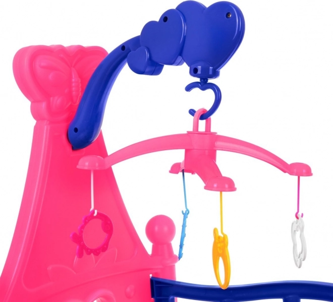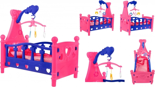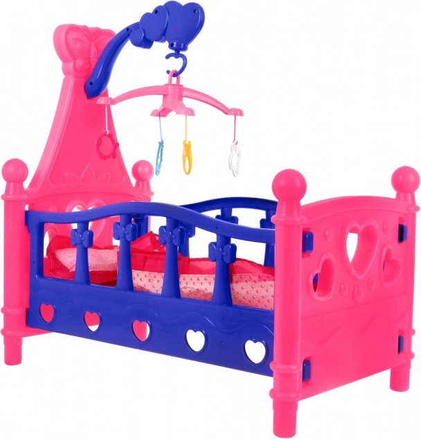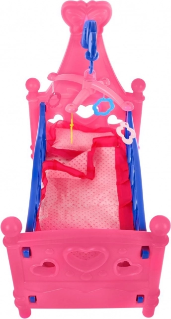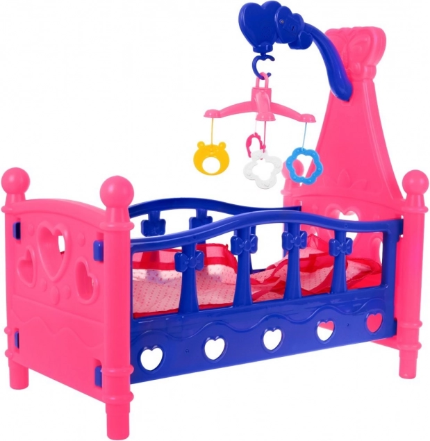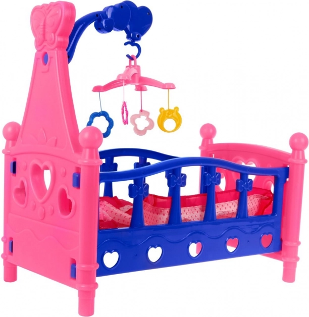 Ovaj dječji krevetić za lutke izvrstan je dodatak svakoj dječjoj sobi. Ističe se vedrom ružičasto-plavom kombinacijom, izrezima u obliku srca i funkcionalnim vrtuljkom s raznobojnim privjescima. U pakiranju su i tekstilni madrac, jastučić i pokrivač kako bi omiljena lutka mogla udobno spavati.