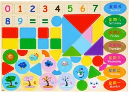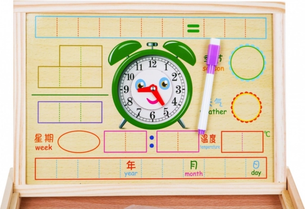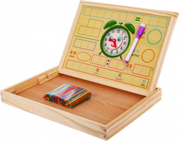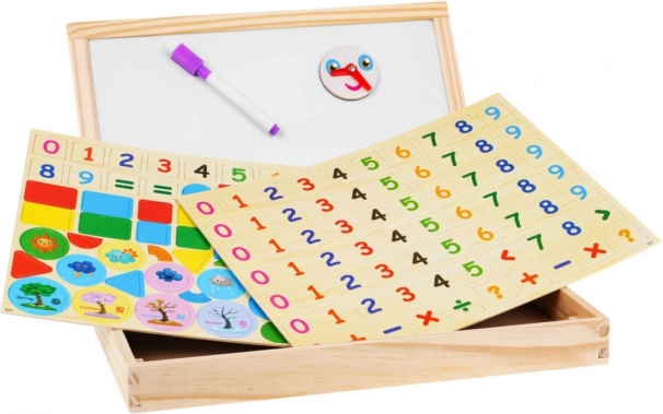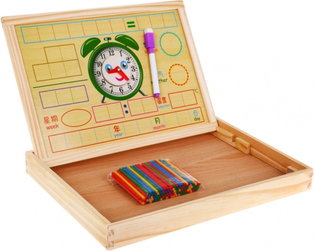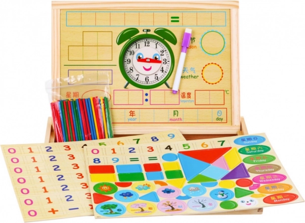 Ovaj kvalitetan drveni set osmišljen je kako bi djeci pružio raznolike mogućnosti učenja i zabave. Pomaže im upoznati brojeve, zbrajanje, oduzimanje, množenje i dijeljenje, naučit će se snalaziti u vremenu zahvaljujući magnetnom satu te prepoznavati oblike, dane u tjednu, vrijeme i godišnja doba. Obostrana magnetska ploča i brisiva olovka omogućuju ponavljano vježbanje bez nereda.