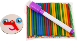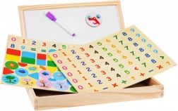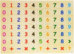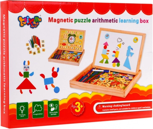 Praktična drvena kutija služi kao spremište cjelokupnog pribora, a na njenoj donjoj strani nalazi se tablica množenja za brzu provjeru rezultata. Zahvaljujući priloženim karticama i uputama djeca mogu slagati slike od magnetnih oblika te tako razvijati kreativnost i finu motoriku.