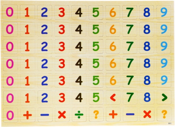 - Drvena kutija s tablicom množenja na donjoj strani; magnetne kartice s brojevima; magnetne kartice sa znamenkama (+, −, ×, ÷, >, <, =, ?); šareni magnetni oblici; magnetne kružnice s vremenom, godišnjim dobima i danima u tjednu; magnetni sat; obostrana magnetska ploča; šareni drveni računalski štapiće; slikovne upute; brisiva olovka s magnetom