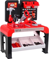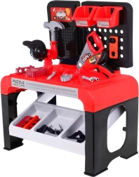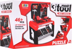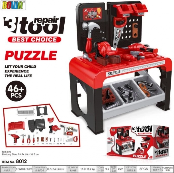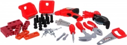Set sadrži 46 elemenata uključujući ručnu bušilicu, odvijač s izmjenjivim nastavcima, ručnu i kružnu pilu, čekić, kliješta, drvene pločice za vijčanje, vijke, kočiće i čavle. Polica za odlaganje i dvije viseće kutije održavaju red u alatu, pa se nakon igre sve lako pospremi.