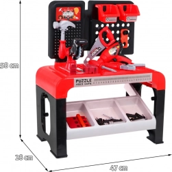 Bogatije opremljena dječja radna klupa za male majstore od 3 godine donosi 46 dijelova alata i dodataka. U kompletu su ručna bušilica, pile, čekić, odvijač s izmjenjivim bitovima i spremnici. Klupa ima otvore za vijčanje i pomaže razvijati finu motoriku, kreativnost i igru uloga u radionici.