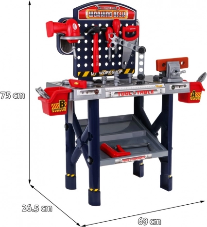 | - radionica cca 69 cm x 26,5 cm x 75 cm, - odvijač cca 13 cm x 15,5 cm, - posudice za alat cca 9,5 cm x 9,5 cm, - pakiranje cca 53 cm x 37 cm x 13 cm. |