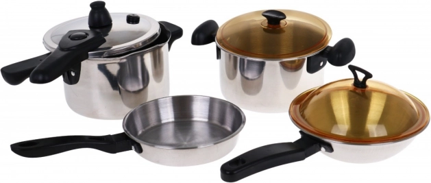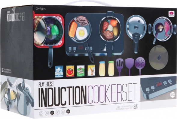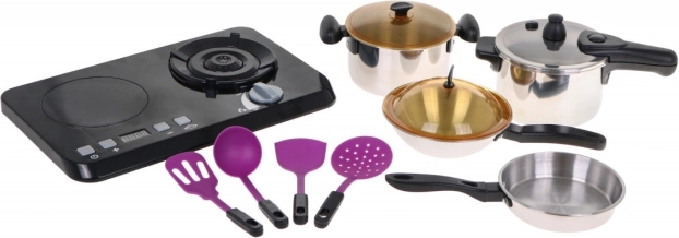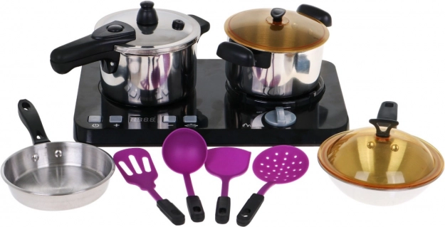 | Izvrsno opremljen kuhinjski set koji se sastoji od indukcijske ploče, lonaca i pribora za kuhanje, namijenjen djeci od tri godine. Tava, lonac i ekspres lonac izgledaju kao pravi, ali u minijaturnom izdanju. Indukcijska ploča napaja se s 3 AA 1,5 V baterije (nisu uključene) i opremljena je zvučnim i svjetlosnim efektima. S lijeve strane nalazi se osvijetljeni plamenik sa zvukovima kuhanja i panelom za promjenu vremena kuhanja od 2 do 20 minuta. S desne strane je osvijetljeni plamenik sa zvukovima prženja i gumbom za uključivanje/isključivanje. U kompletu se nalaze i makete hrane. | ||