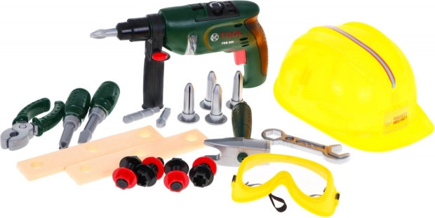 Set za male majstore s bušilicom, naočalama, kacigom i alatom prikladan je za djecu od 3 godine naviše. Igračka pozitivno utječe na razvoj logičkog razmišljanja, potiče kreativnost i podržava koordinaciju oko-ruka. Odvijač se napaja baterijama 2 x AA 1,5 V - nisu uključene u pakiranje.