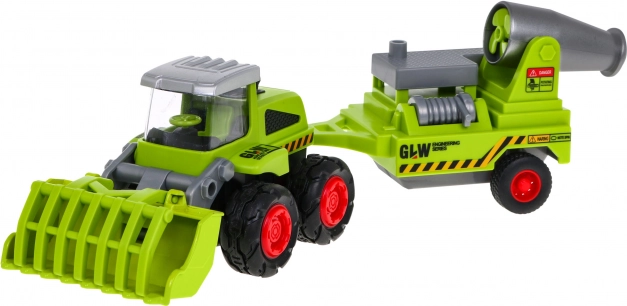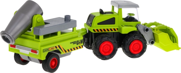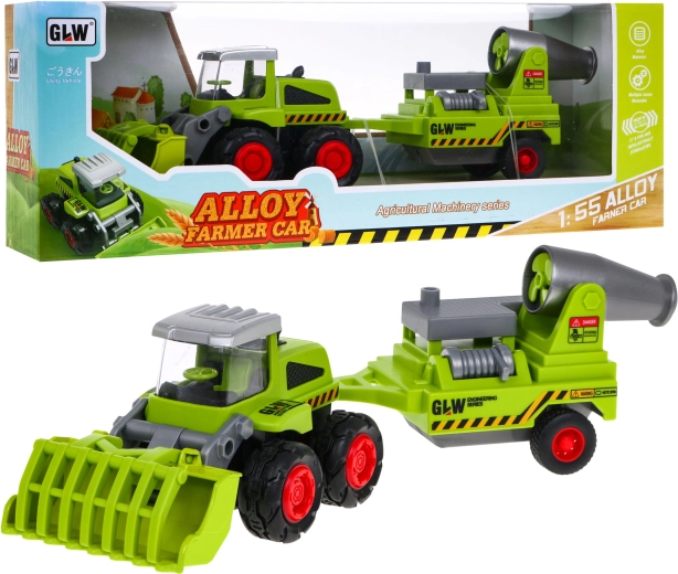Metalni poljoprivredni utovarivač s prikolicom idealna je igračka za male farmere starije od tri godine. Ova igračka sadrži pomičnu metalnu žlicu i odvojivu prikolicu s prskalicom, gumene kotače i pogon stražnje osovine.