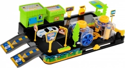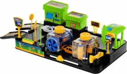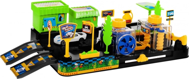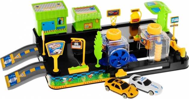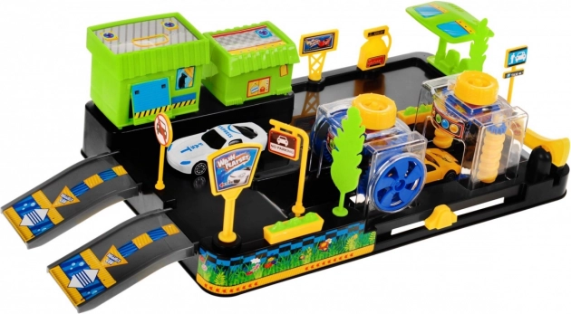 U pakiranju ćete pronaći 2 autića, rampe, rampe s preprekama, znakove i dekoracije uključujući benzinsku postaju i market/restoran.