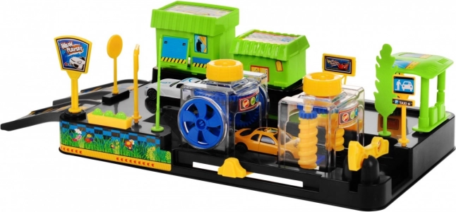 Sastavni dio je sve što mali vozači trebaju: 2 raznobojna autića, velika baza, prometna signalizacija, rampe, pomična rampa s branom i bogate dekoracije (drvca, žardinjere, market/restoran, benzinska postaja). Zahvaljujući živim bojama i preciznoj izradi set je atraktivan i za zahtjevnije male graditelje.