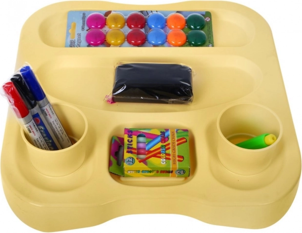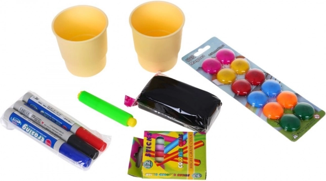 U pakiranju se nalaze plastične čašice, set flomastera, kreda, magneta i držač za krede, koji podupiru sve vrste umjetničkih aktivnosti.