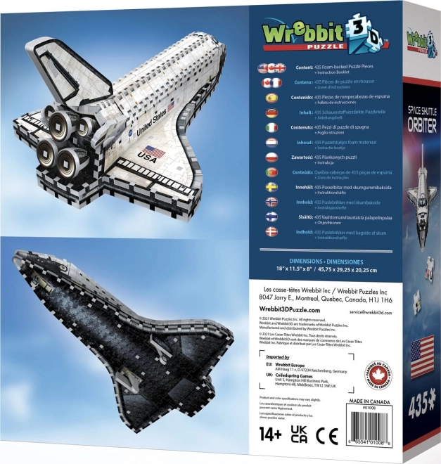 Otkrijte radost slaganja trodimenzionalnog modela shuttlea koji vjerno kopira stvarni Orbiter – jedini dio svemirskog sustava koji ulazi u orbitu i sigurno se vraća na Zemlju. 3D puzzle WREBBIT pružaju uravnotežen izazov i zabavu zahvaljujući neoznačenim dijelovima i jasnim referentnim slikama.
