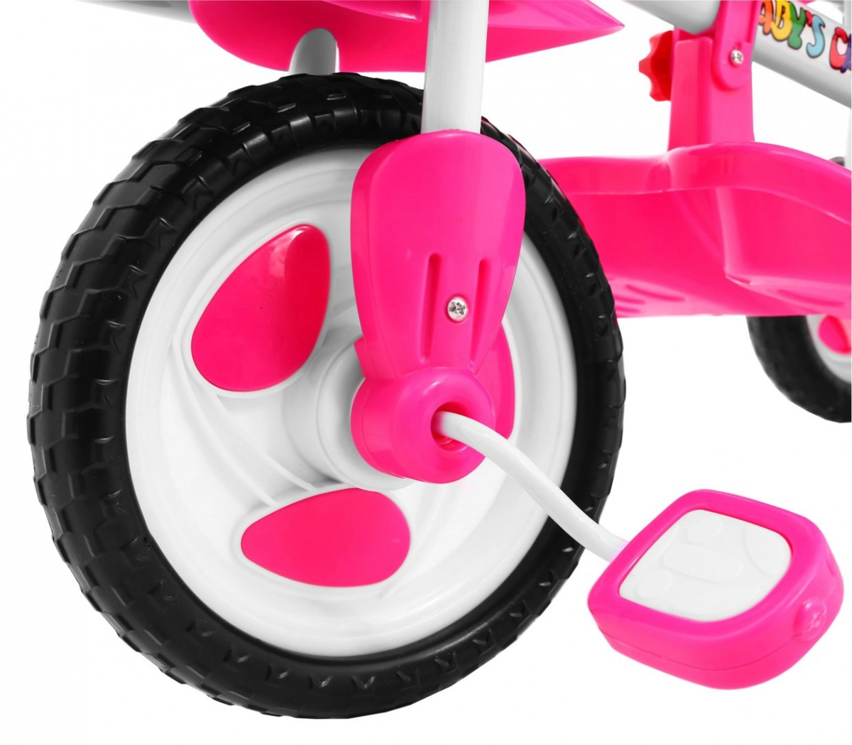 Ova stabilna dječja tricikla s čeličnim okvirom raste s vašim djetetom. Zahvaljujući trosatnoj (3-stupanjskoj) roditeljskoj ručki povezanoj s upravljačem lako korigirate smjer vožnje, dok raskopčavajuća sigurnosna prečka i podesiva udaljenost sjedala do pedala osiguravaju ispravno i sigurno sjedenje malih vozača.