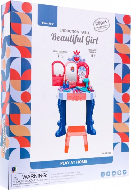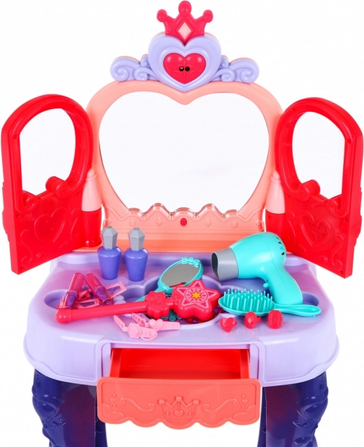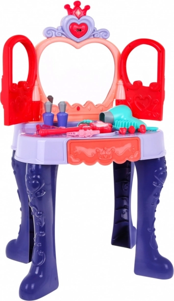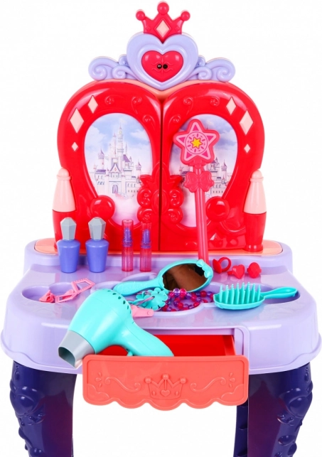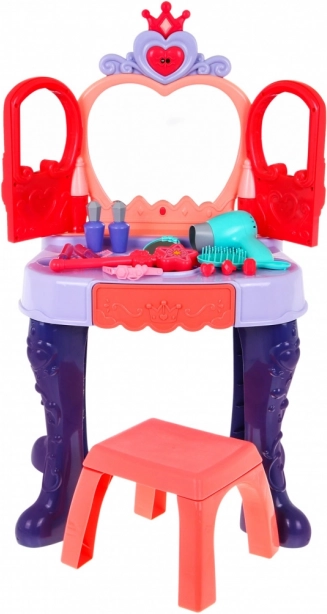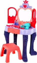Stolić ima praktičnu kliznu ladicu za sve sitnice i bogatu opremu: češljić, zrcalce, prstenove, narukvice, kopčice, gumice te makete ruževa i parfema. Stabilna konstrukcija, ugodne dimenzije i udoban stolac osiguravaju udobnu igru i lako smještanje u dječjoj sobi.