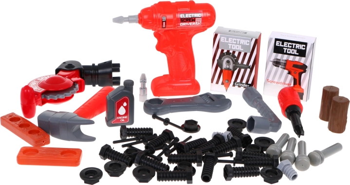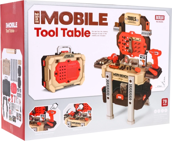 Sadržaj pakiranja (izbor od 78 kom): kofer, stalak, bušilica/odvijač s izmjenjivim nastavcima, pila, čekić, križni odvijač, cijevni i podesivi ključ, drveni dijelovi, vijci, matice, naljepnice i drugi pribor.