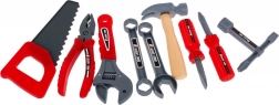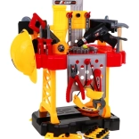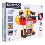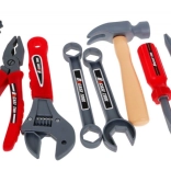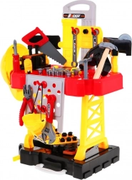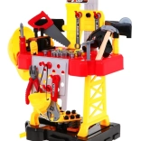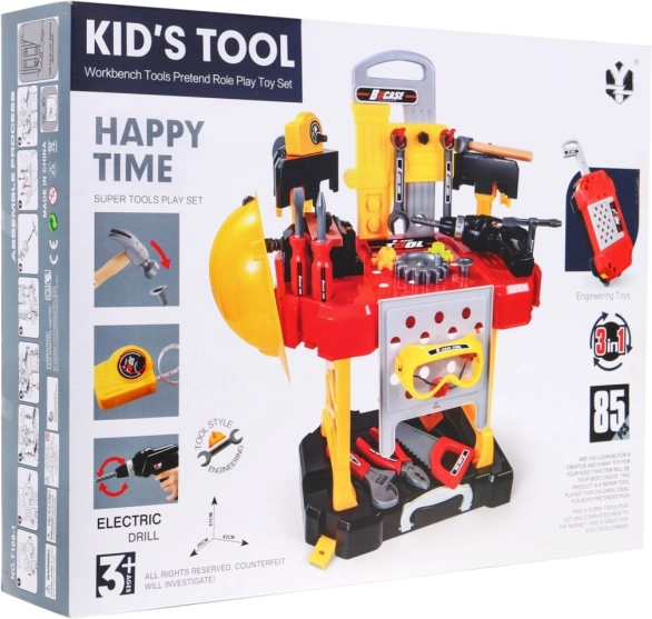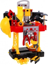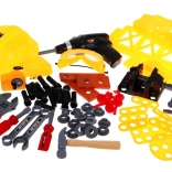 U kompletu je bogata oprema: akumulatorska bušilica/odvijač, čekić, škripac, pila, kliješta, imbus i viljuškasti ključevi, odvijači, vijci, matice, zupčanici, metar te radni elementi s navojima za beskrajno zavrtanje i montiranje. Zahvaljujući pametnoj organizaciji alata djeca vježbaju red, strpljenje i koordinaciju oko–ruka.