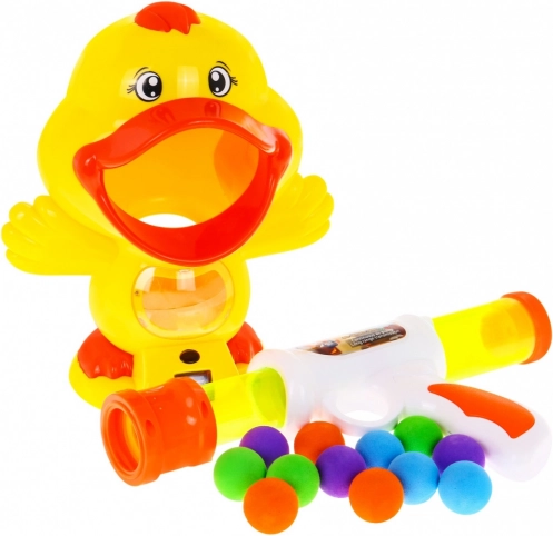 Slatka meta u obliku patke s otvorenim kljunom skuplja kuglice, reagira zvukom nakon pogotka i olakšava kontinuirano brojanje rezultata.