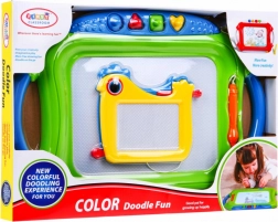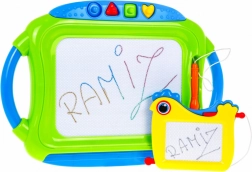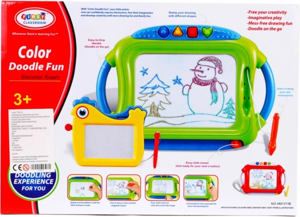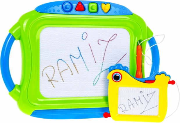 Ovaj set sadrži veliku magnetsku ploču s višebojnim efektom crtanja i četiri žiga plus manju ploču s jednobojnim zapisom. Obje ploče imaju pričvršćene olovke na vrpci kako se ne bi izgubile te praktičan klizač za brzo brisanje uradaka.