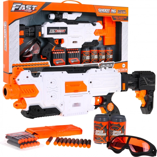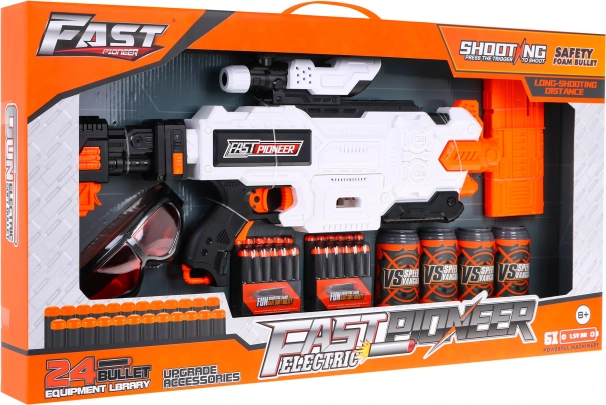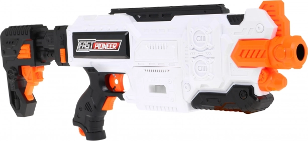 Električni blaster FAST PIONEER nudi djeci akcijsku zabavu kod kuće i na otvorenom. Zahvaljujući poluautomatskom okidanju dovoljno je držati tipku napajanja, naciljati i pritisnuti okidač – svaki pritisak znači jedan precizan hitac. Podvjesni spremnik prima do 10 metaka, a podesivi nišan olakšava pogotke u mete.