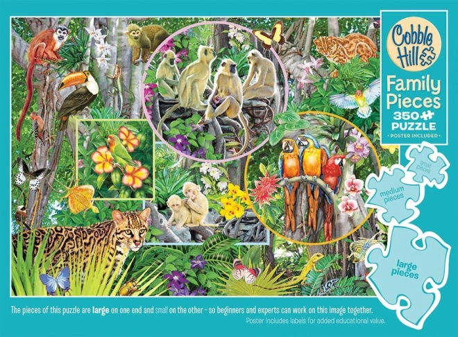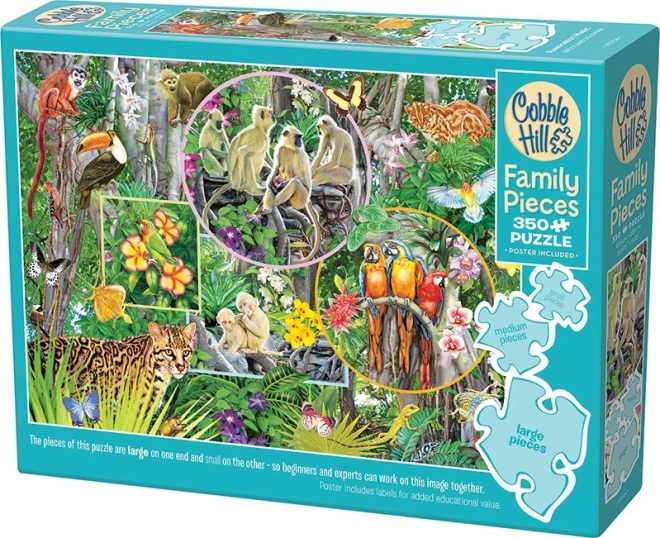 Uživajte u zajedničkim trenucima s obiteljskom slagalicom COBBLE HILL – Čarolija prašume s 350 dijelova u tri veličine. Zahvaljujući malim, srednjim i velikim dijelovima u slaganju mogu uživati djeca, roditelji i bake i djedovi. Neobični oblici dijelova i neasimetrična matrica rezanja donose zabavan izazov i bolje iskustvo slaganja. Dovršena slika ima dimenzije cca 67,6 × 48,9 cm.