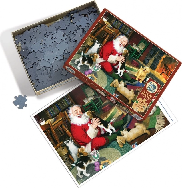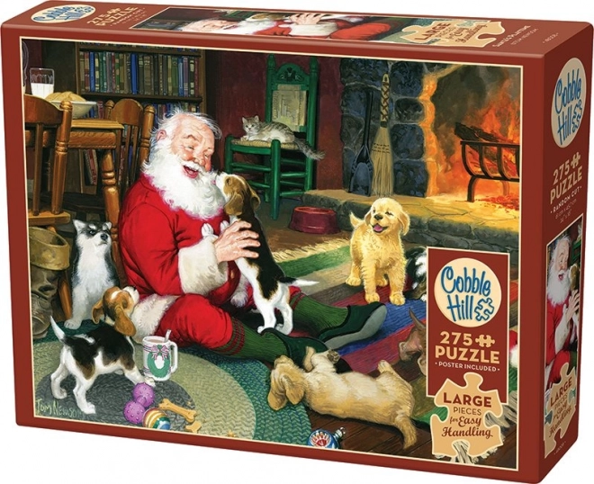 Ilustracija Djeda Mraza uz kamin sa životinjskim prijateljima stvara radosnu, toplu atmosferu – idealna puzzle igra za zimske večeri.