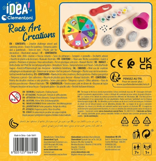 Razvijte dječju maštu s kreativnim setom Clementoni IDEA za ukrašavanje kamenčića. Stvarajte originalne kamenčiće pomoću tempera, samoljepljivih očiju i zabavnih izazova. Set potiče kreativnost, finu motoriku i maštu te je odličan za zajedničko stvaranje djece i roditelja.