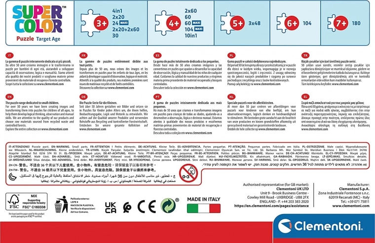 Kvalitetna izrada brenda Clementoni jamči žarke boje, precizne oblike i ugodnu površinu dijelova. Gotove slike možete više puta rastaviti i ponovno sastaviti ili ih podložiti i pretvoriti u dekoraciju za dječju sobu.