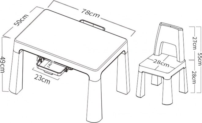 Dimenzije stola su 78 x 50 x 49,54 cm, a stolice 28 x 28 x 55 cm, što je idealna veličina za djecu od 3 do 9 godina.