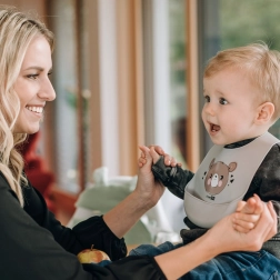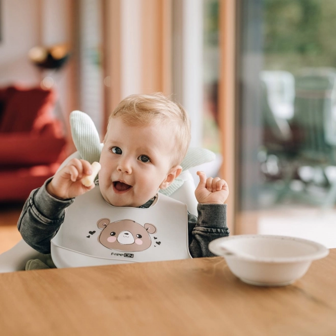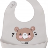 Suočavate li se s borbom protiv mrlja pri svakom hranjenju? Ovaj silikonski podbradak s motivom medvjedića može vam pomoći! Mekan je, lagan i udoban, pa će ga vaše dijete nositi čak i za duljih sjedenja za stolom. Zahvaljujući podesivom zatvaranju oko vrata podbradak će rasti s vašim djetetom. Veliki džep za sakupljanje osigurava da ostatci hrane završe tamo gdje trebaju, a ne na odjeći vašeg djeteta.
