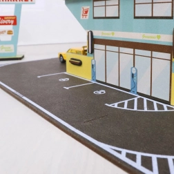 Supermarket s burger restoranom, parkiralištem i signalizacijom stvara vjernu scenu koja uvlači djecu u igru i razvija njihovu maštu.