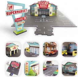Uz ovaj kreativni građevni set izgradit ćete supermarket s burger restoranom, parkiralištem, ulazima i izlazima te povezanim cestama. Dijelovi se lako spajaju, čvrsto drže tijekom igre i djeci nude sate maštovite vožnje autićima. Kartonske i drvene komponente iz odgovorno nabavljenih materijala jamče izdržljivost i prijaznost prema okolišu.