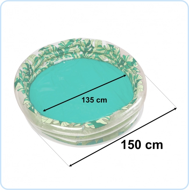 Ovaj prekrasan napuhujući bazen s grafikom zelenog lišća postat će predivna dekoracija vaše okućnice i mjesto nezaboravne zabave za vaše dijete. Zahvaljujući dimenzijama – promjer 150 cm, unutarnji promjer 135 cm – dovoljno je prostran za više djece.