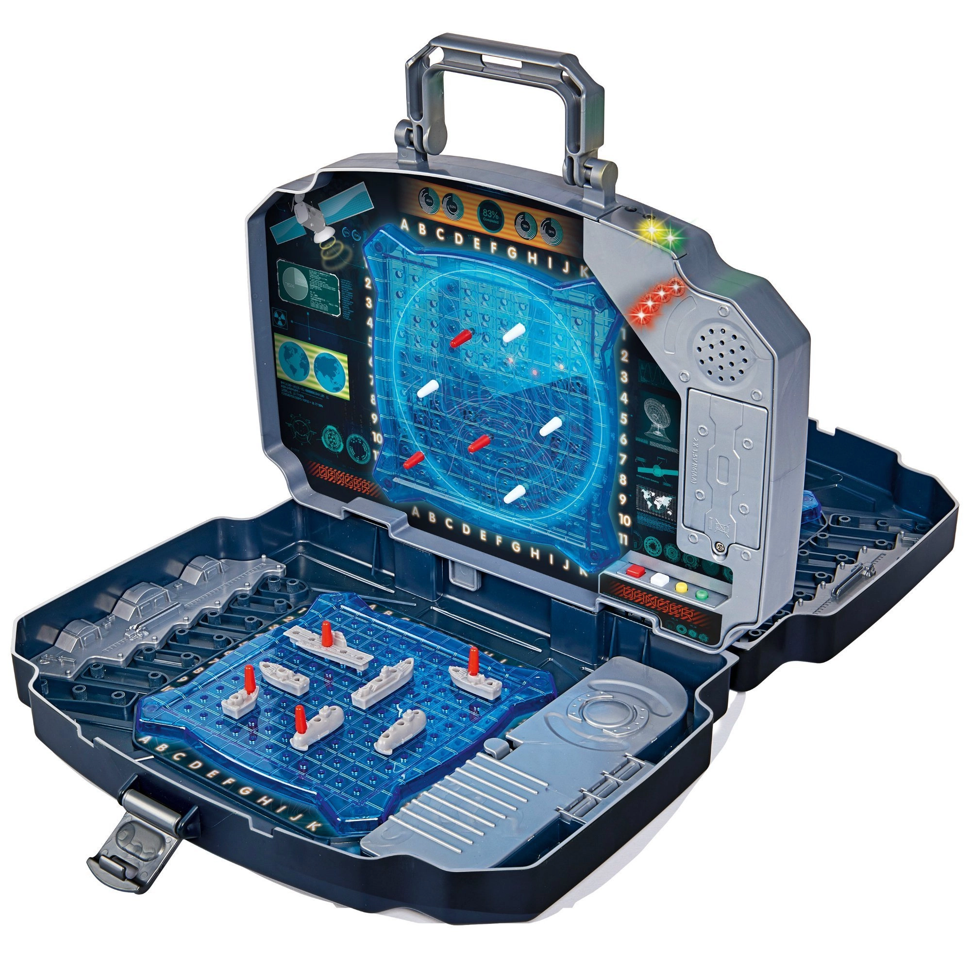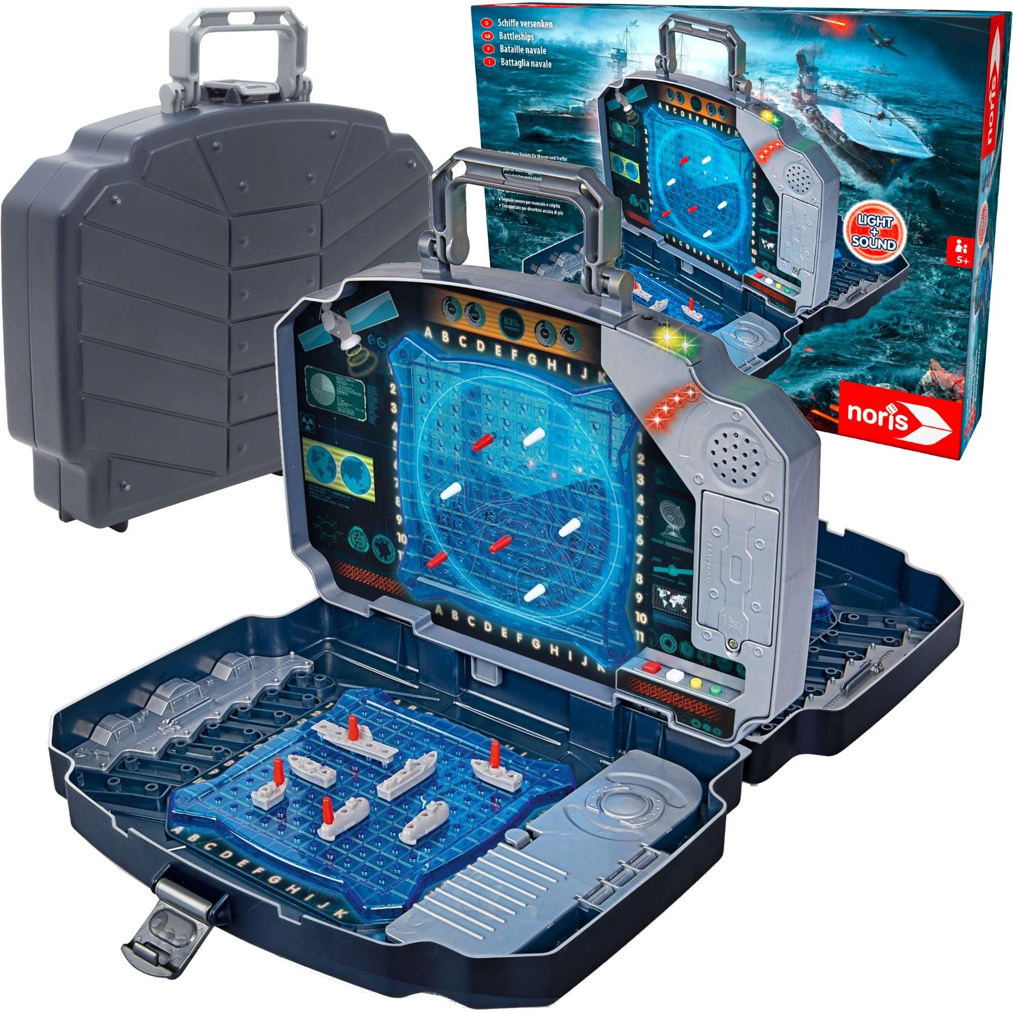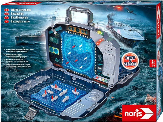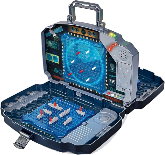 Prijenosna elektronička igra Pomorska bitka u izdržljivom koferu s dvjema plavim igraćim mrežama, spremišnim pretincima te efektima svjetla i zvuka. Namijenjena je za 2 igrača, olakšava praćenje pogodaka pomoću crvenih i bijelih klinova i nudi intuitivno upravljanje za djecu od 5 godina. Idealno za dom i putovanja.