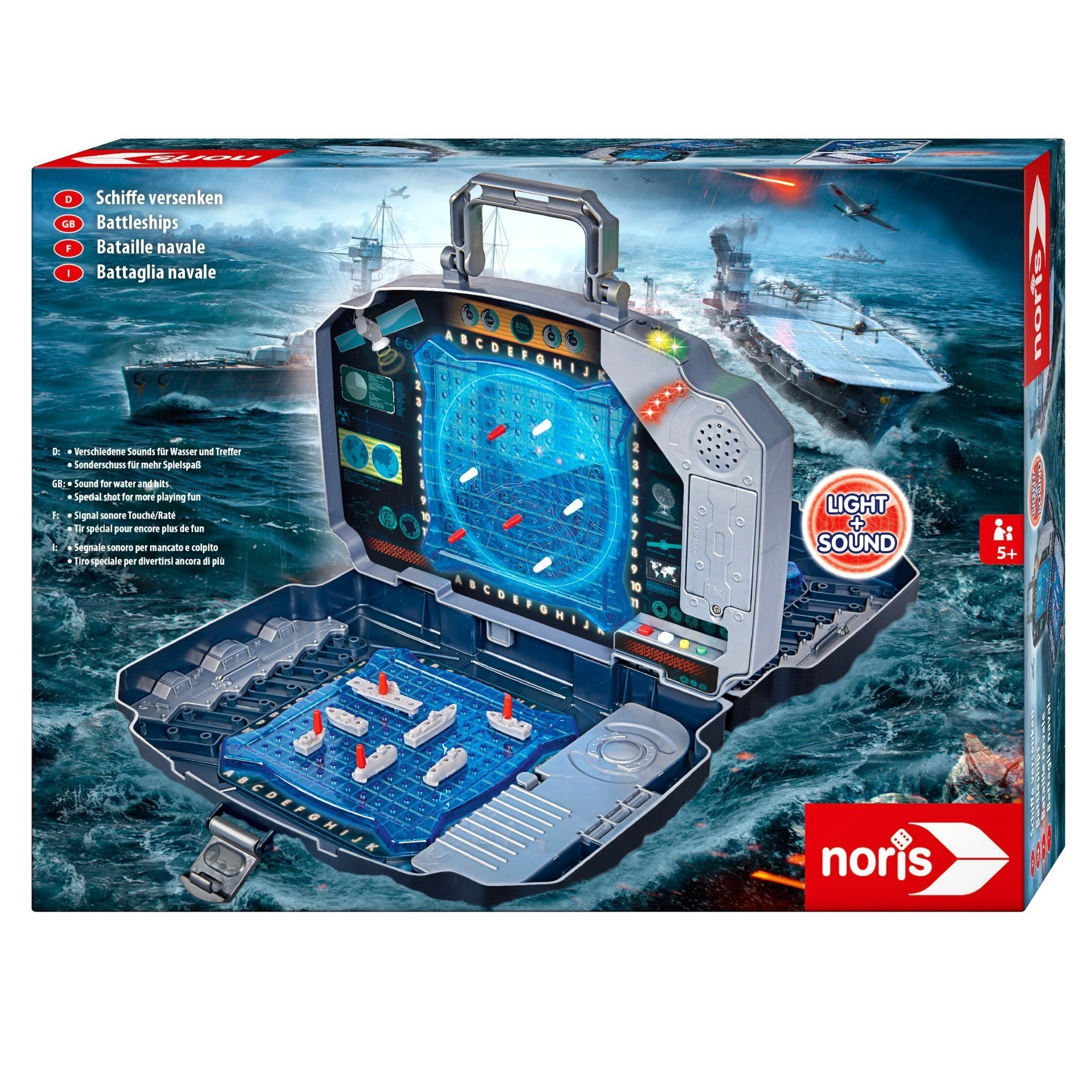 Uživajte u klasičnoj igri Pomorska bitka u modernom izdanju. Čvrsti grafitni kofer skriva dvije plave igraće mreže za raspored brodova i središnji panel za označavanje hitaca na protivnika. Integrirani svjetlosni i zvučni efekti jasno najavljuju pogodak ili promašaj – igra je tako pregledna, napeta i zabavna za cijelu obitelj.
