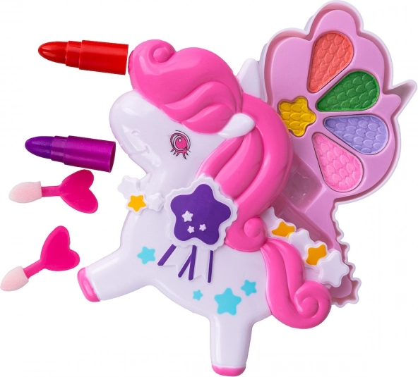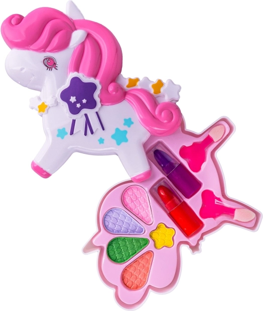 Ovaj očaravajući set šminke u obliku jednoroga idealan je za prve korake u šminkanju. Djeca će uživati u sigurnoj i zabavnoj igri koja potiče maštu i finu motoriku. Preklopna krila otkrivaju paletu živopisnih sjenila za oči, a tu je i ruž za dašak boje na usnama.