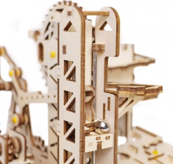Model sadrži tornjevni razdjelnik, spiralne nagibe, dizalicu s kranom i kotačima, kratki tobogan i pametno postavljene sklopke koje mijenjaju putanju kuglica. Težina je ocijenjena 4/5; sastavljanje traje približno 6–7 sati. Nakon dovršetka jednostavno zavrtite ručku i prepustite se dinamičnom prizoru koji zorno prikazuje principe STEM-a.