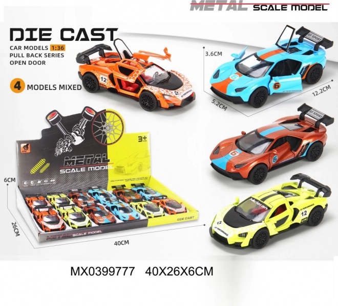Uživajte u brzoj zabavi s metalnim trkaćim autićem u mjerilu 1:36. Model nudi otvarajuća vrata, kvalitetnu metalnu izradu i popularnu funkciju pull back – navuci i vozi. Dostupna su 4 atraktivna dizajna za još više zabave i kolekcionarskog uzbuđenja.
