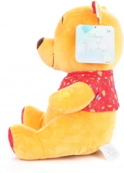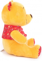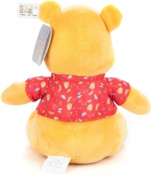 Medvjedić Pooh izrađen je od mekog žutog pliša i nosi crvenu majicu s dekorativnim uzorkom, što ga čini idealnim pratiteljem za grljenje.